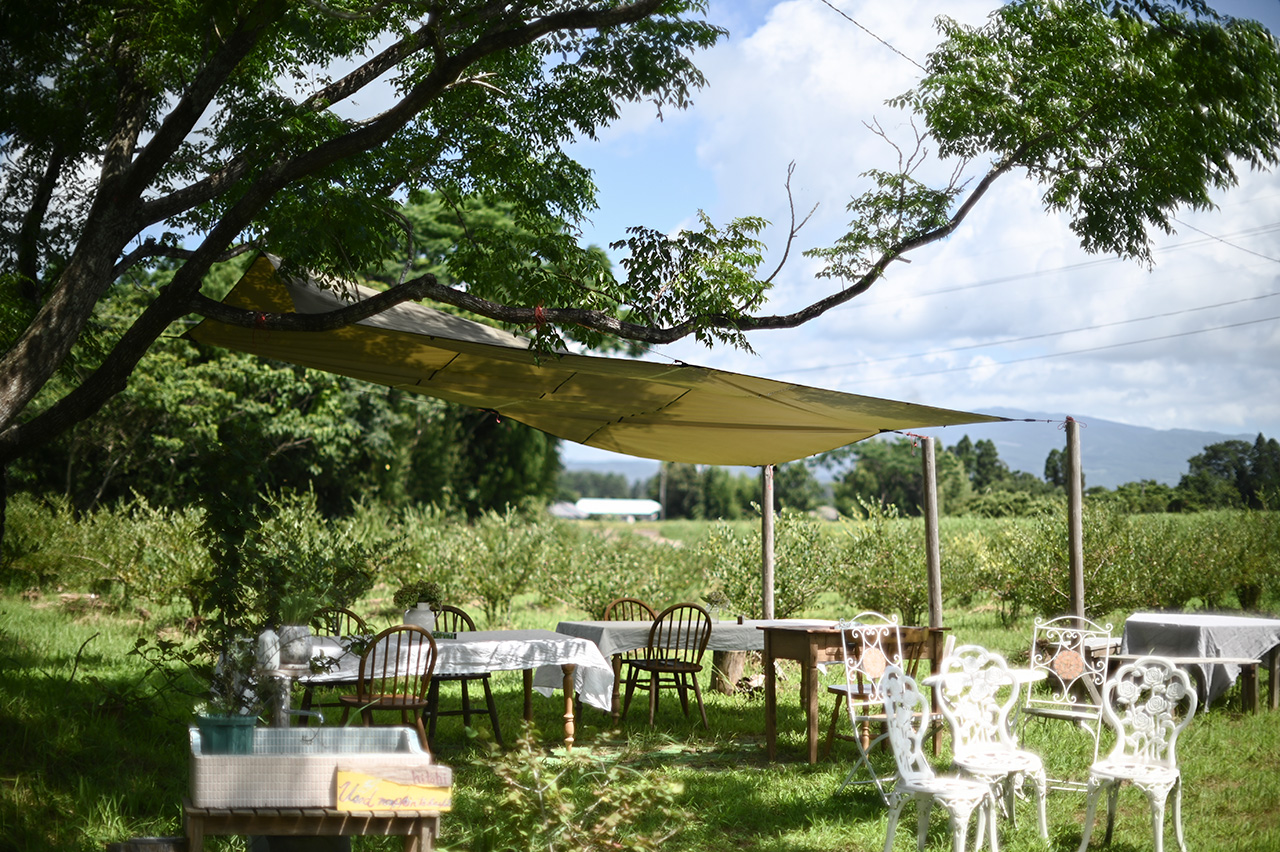 テーブルをおいて、土のやわらかさを感じながら座り、